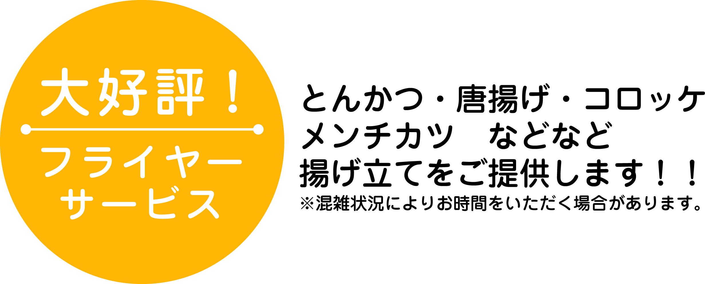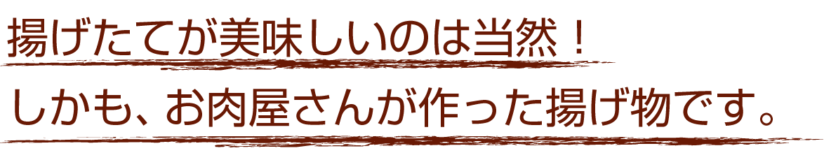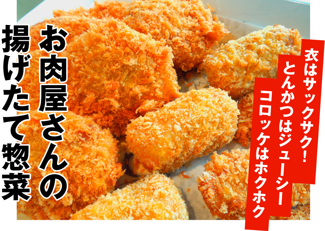 「お肉屋さんが作った揚げ物」、この言葉だけでも美味しいだろうなと想像できると思います。 その言葉通り、本当に美味しいんです。 それもそのはず、揚げ物商品に使用されているお肉も販売されているものと同じお肉を使用しています。 つまり、品質にこだわったお肉を使用しています。しかもふんだんに使用しています。 更にご希望の方には揚げたてをご提供いたします。混雑状況などにもよりますが、通常約5~10分で揚げることができます。